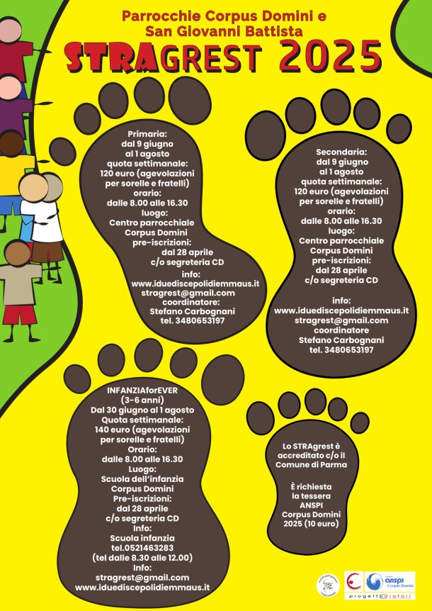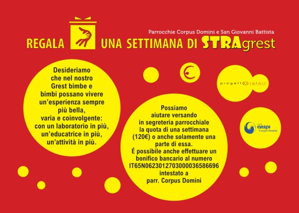 RIDUZIONE per fratelli/sorelle frequentanti contemporaneamente lo stesso centro estivo o lo stragrest parrocchiale – 120 € due fratelli/sorelle, 100 € più di due fratelli/sorelle)