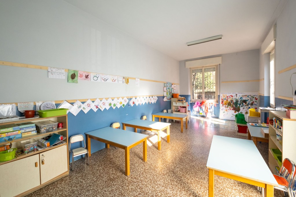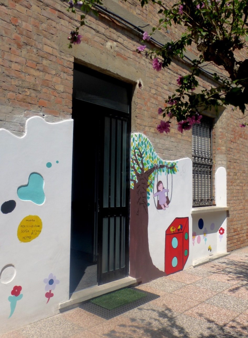 esternamente circondata da una mura di laterizi che delimita un piccolo giardino e un cortile, con orto annesso, ad uso esclusivo dei nostri bimbi e bimbe.